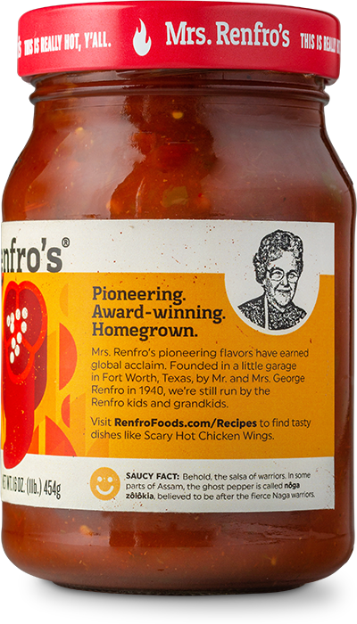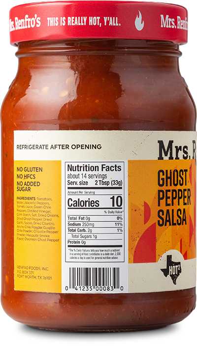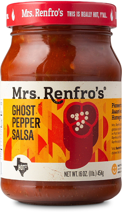 Mrs. Renfro's Ghost Pepper Salsa, at our hottest heat level, with no gluten and no added sugar. Made in Fort Worth, Texas.