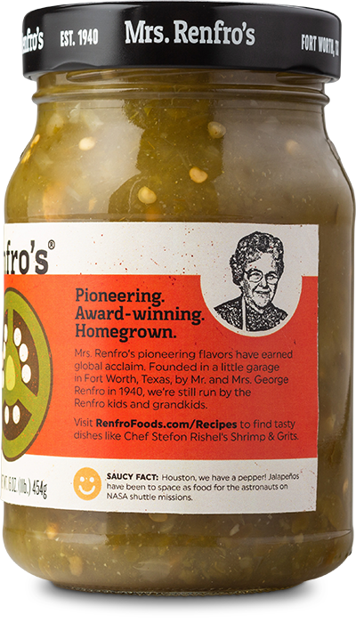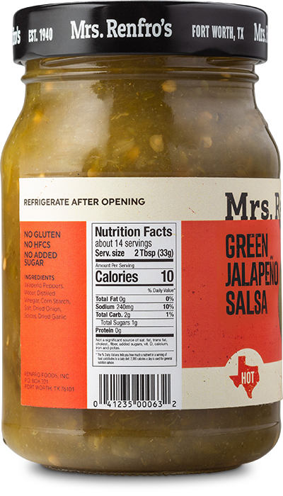 Mrs. Renfro's version of green salsa uses jalapeños rather than tomatillos as the main ingredient, for extra spice. At a hot heat level, this salsa is free of gluten, high-fructose corn syrup and added sugar. Made in Fort Worth, Texas.