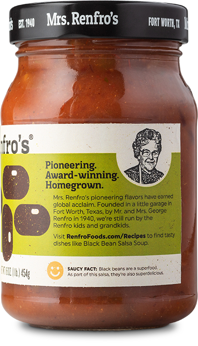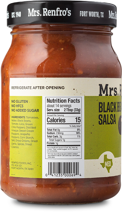 Mrs. Renfro's Black Bean Salsa, at a medium heat level, is gluten-free, with no high-fructose corn syrup or added sugar. Made in Fort Worth, Texas.