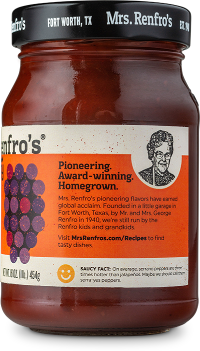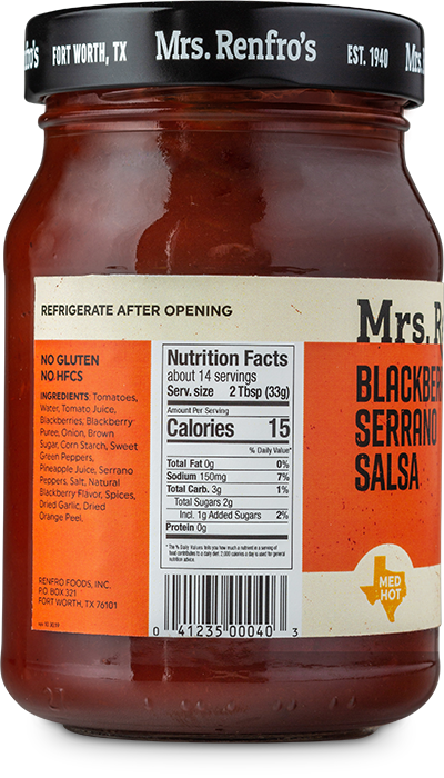 Mrs. Renfro's Blackberry Serrano Salsa, at a medium-hot heat level, has a fruity flavor and is gluten-free, with no high-fructose corn syrup.