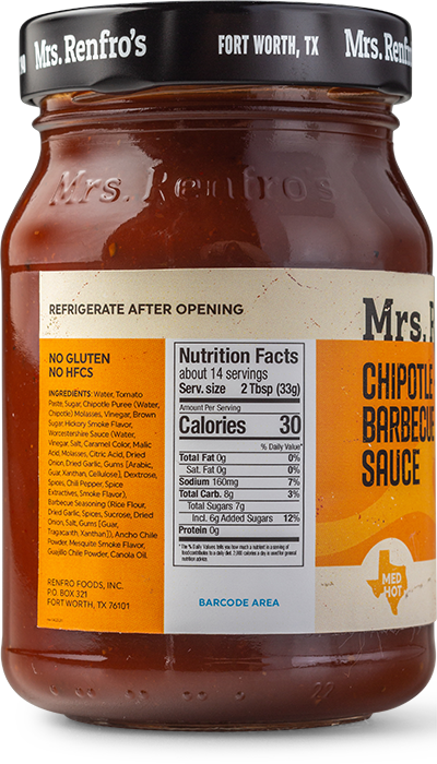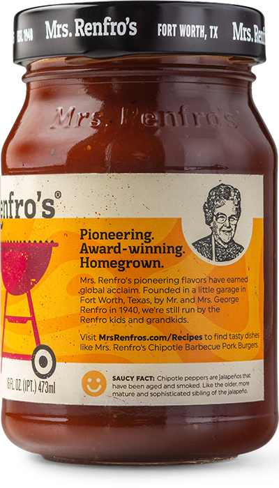 Mrs. Renfro's Chipotle Barbecue Sauce, at a medium-hot heat level, has a smoky flavor and is gluten-free, with no high-fructose corn syrup. Made in Fort Worth, Texas.