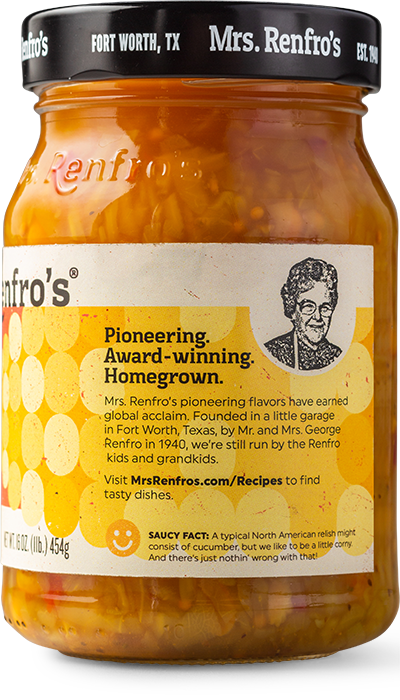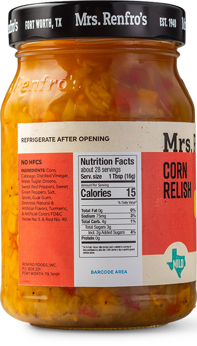 Mrs. Renfro's Corn Relish, at a mild heat level, is a sweet pickled cabbage relish with onions and sweet red peppers. This relish is free of high-fructose corn syrup. Made in Fort Worth, Texas.