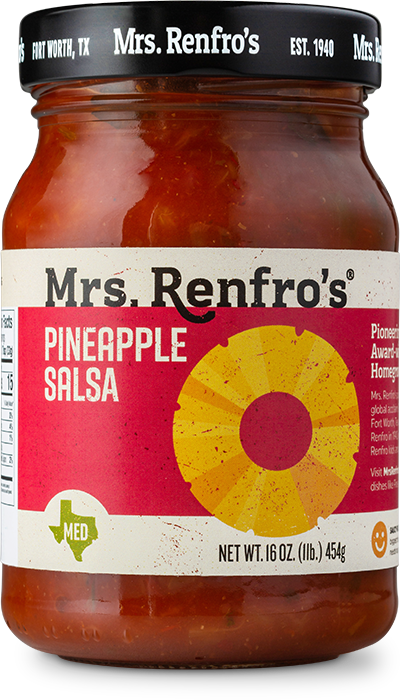 Mrs. Renfro's Garlic Salsa, at a medium heat level and contains no cilantro. Made in Fort Worth, Texas.