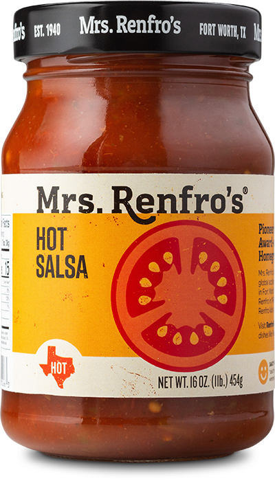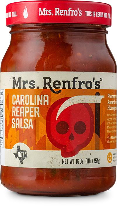 Mrs. Renfro's Ghost Pepper Salsa, at our hottest heat level, with no gluten and no added sugar. Made in Fort Worth, Texas.