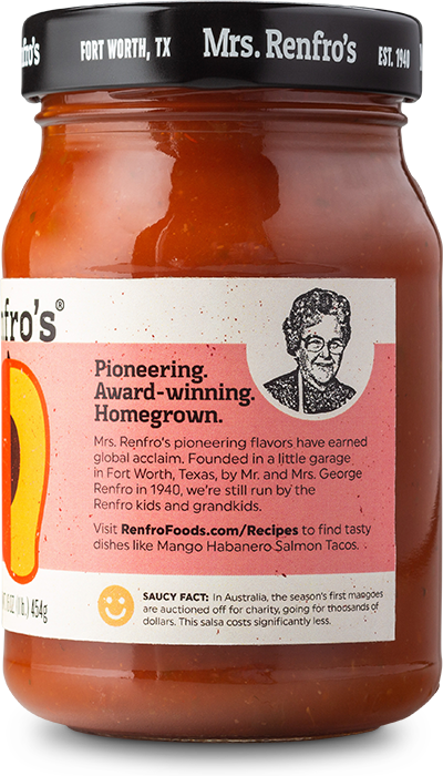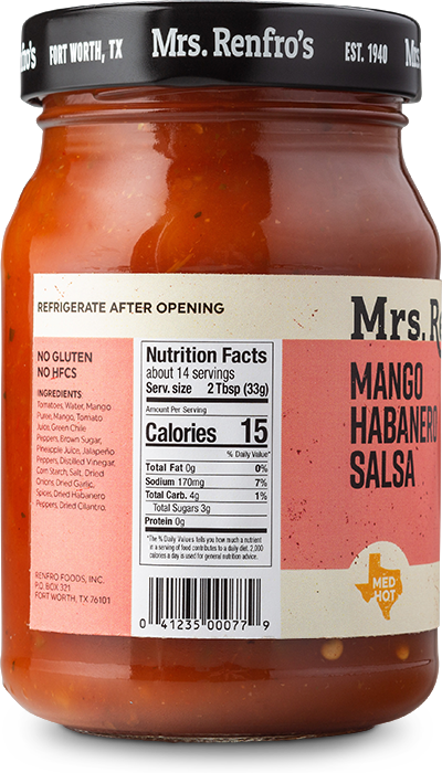Mrs. Renfro's Mango Habanero Salsa, at a medium-hot heat level, is fruity and spicy. This salsa is gluten-free, with no high-fructose corn syrup. Made in Fort Worth, Texas.