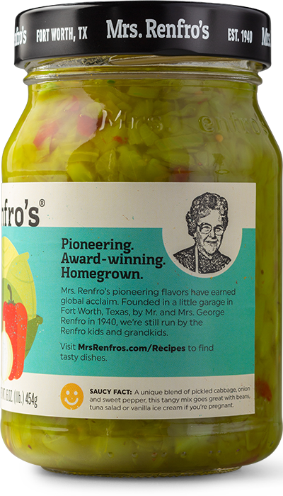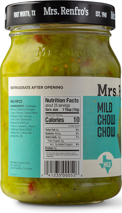 Mrs. Renfro's Mild Chow Chow, at a mild heat level, is a southern-style cabbage relish. Made in Fort Worth, Texas.