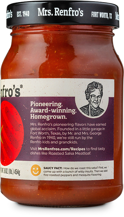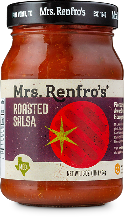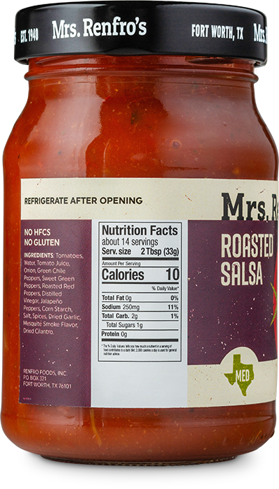 Mrs. Renfro's Roasted Salsa, at a medium heat level, is gluten-free, with no high-fructose corn syrup. Made in Fort Worth, Texas.