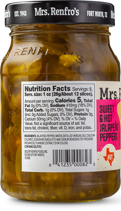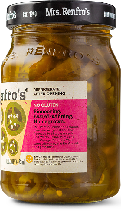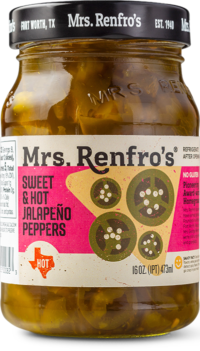 Mrs. Renfro's Sweet and Hot Jalapeno Peppers add a spicy zing to any dish. Gluten-free, at a Hot heat level. Made in Fort Worth, Texas.